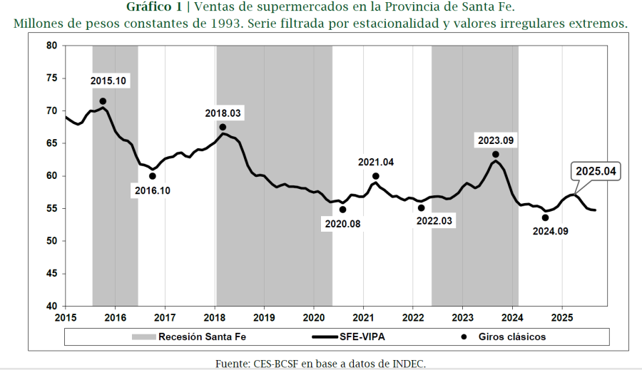 Las ventas en supermercados de la provincia de Santa Fe atraviesan uno de los momentos más débiles de la última década. Así lo revela un informe elaborado por el Centro de Estudios y Servicios (CES) de la Bolsa de Comercio de Santa Fe, que analiza la evolución del consumo en este canal comercial entre 2015 y 2025, a partir de datos oficiales del INDEC.