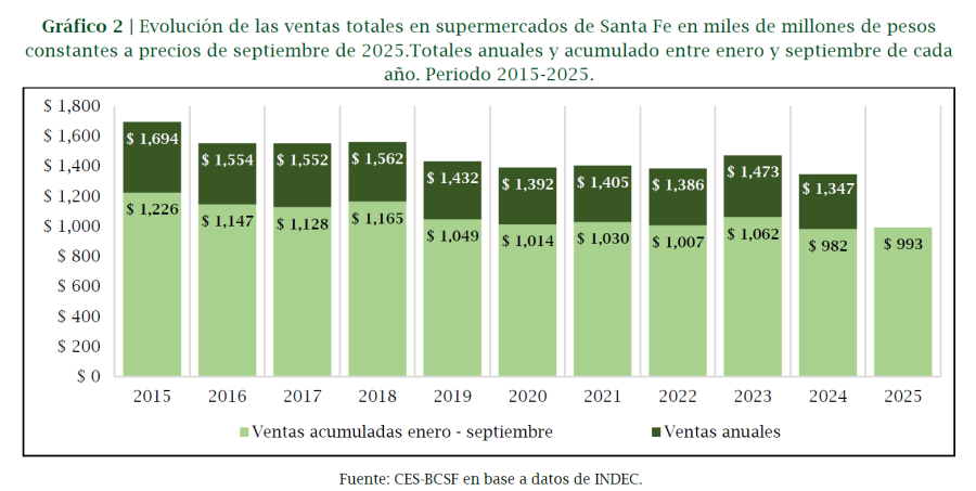 Cuando se amplía la mirada al acumulado anual, el panorama no mejora. El gráfico que compara las ventas totales anuales y el acumulado entre enero y septiembre de cada año muestra que el consumo en supermercados durante los primeros nueve meses de 2025 fue un 19% inferior al registrado en igual período de 2015. De hecho, el nivel actual constituye el segundo más bajo de los últimos diez años para períodos comparables, a pesar de una leve recuperación interanual del 1,1% respecto de 2024.