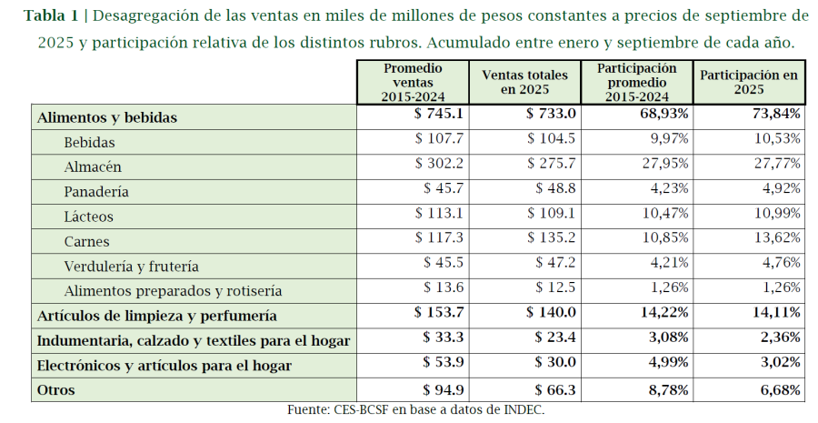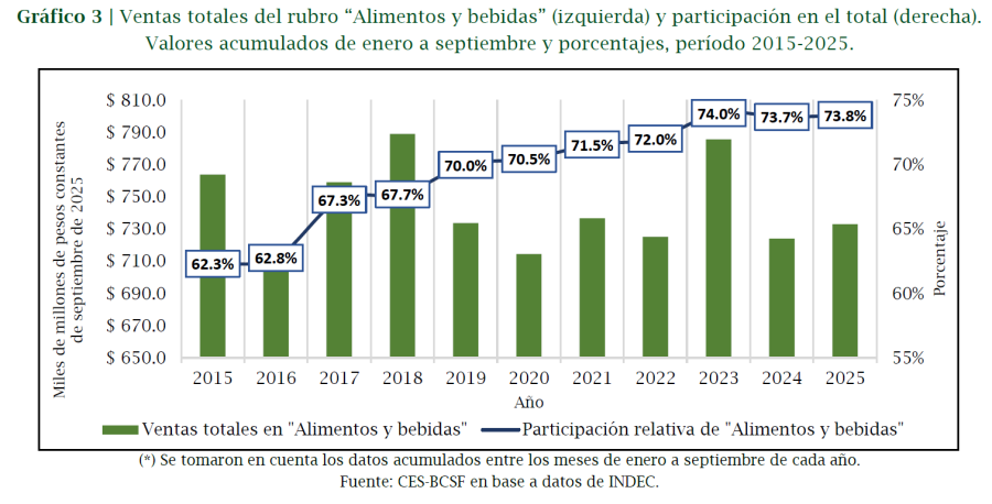 Uno de los ejes centrales del trabajo es la desagregación de las ventas por rubros. Allí se observa con claridad un cambio en la estructura del consumo. El conjunto de “Alimentos y bebidas” concentra en 2025 casi el 74% de las ventas totales, cuando el promedio de la última década rondaba el 69%. El gráfico específico del informe muestra esta paradoja: aunque el gasto real en alimentos se contrajo levemente frente al promedio 2015-2024, su participación relativa creció de manera sostenida.