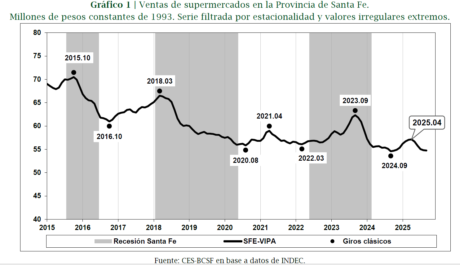 El estudio confirma una tendencia negativa sostenida en el largo plazo, con ciclos de expansión y contracción estrechamente ligados al desempeño de la economía provincial. Sin embargo, a diferencia de otros períodos, en los últimos años las ventas de supermercados mostraron una reacción tardía frente a las fases recesivas. El gráfico que ilustra la evolución mensual de las ventas reales —ajustadas por estacionalidad— permite observar cómo, durante la recesión 2022-2024, el consumo continuó creciendo por varios meses antes de iniciar su deterioro hacia fines de 2023.