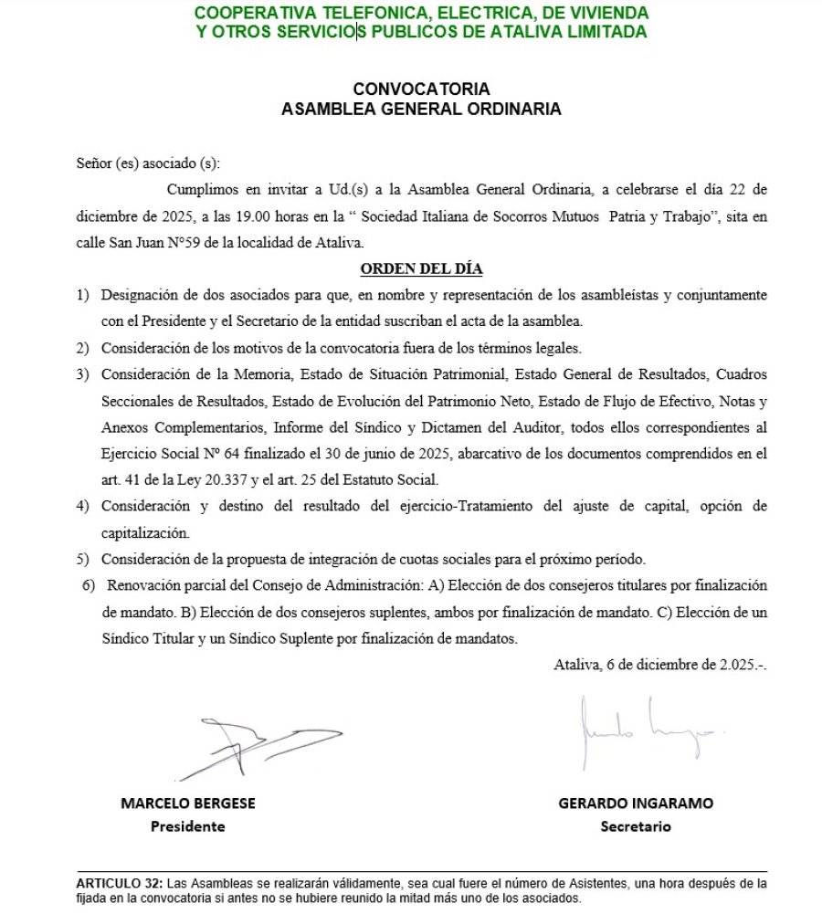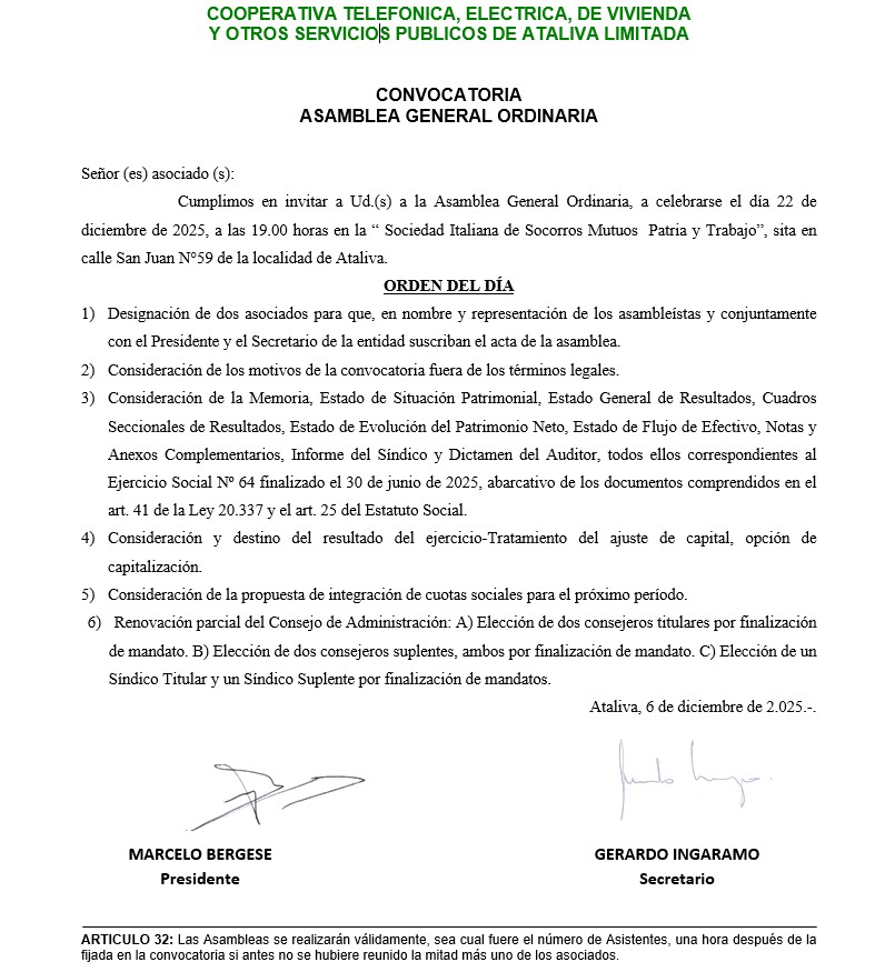 Cumplimos en invitar a Ud.(s) a la Asamblea General Ordinaria, a celebrarse el día 22 de diciembre de 2025, a las 19.00 horas en la “Sociedad Italiana de Socorros Mutuos Patria y Trabajo”, sita en calle San Juan N°59 de la localidad de Ataliva.