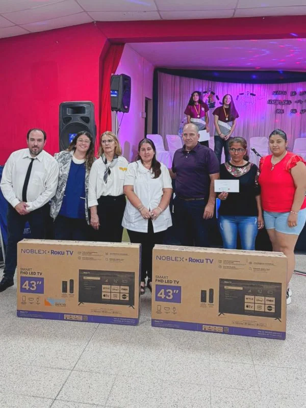 –La escuela N° 6320 Horacio Quiroga, con Smart TV de 43 pulgadas y un aporte de 250,000 pesos para cubrir costos de sonido.