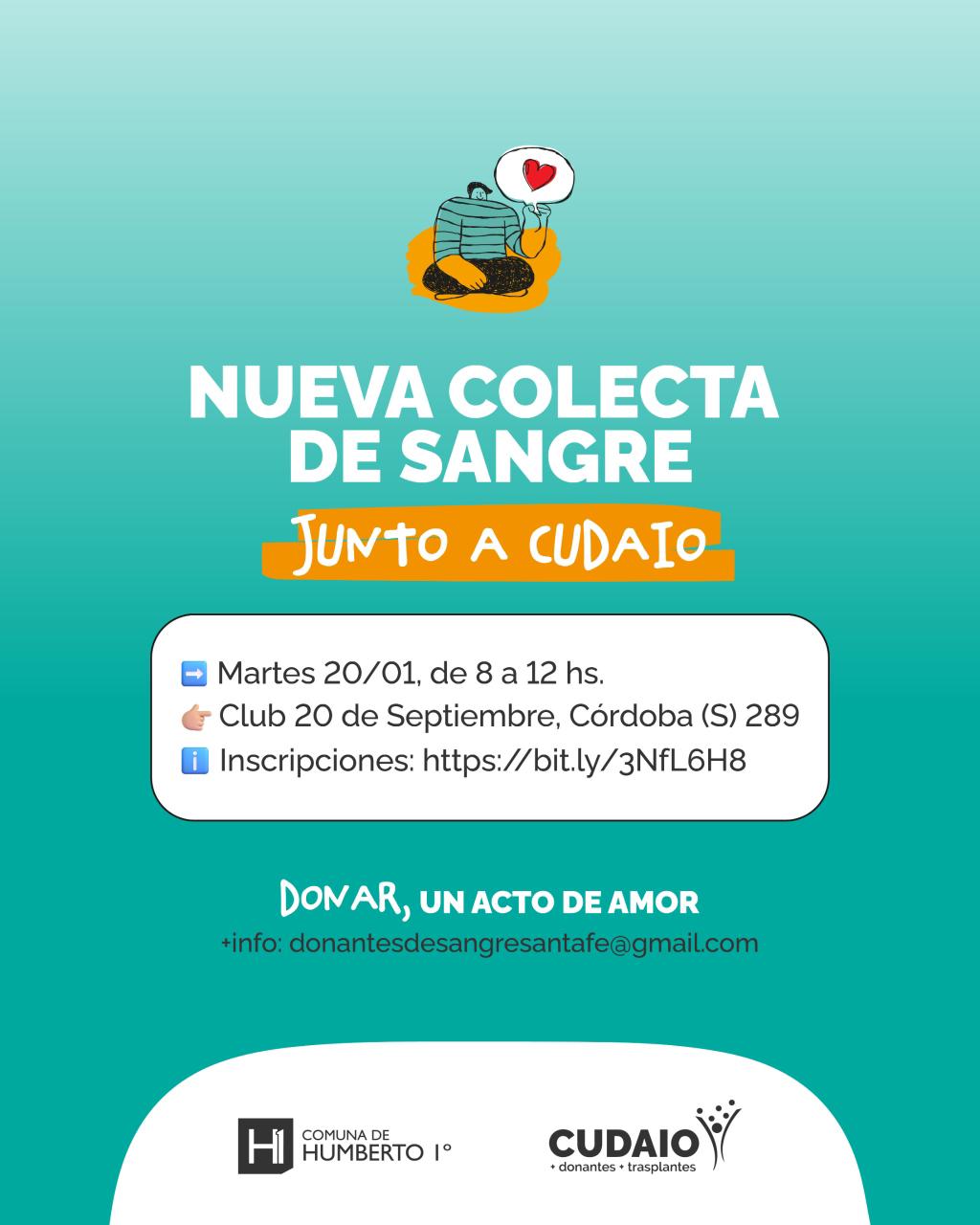 HUMBERTO PRIMO (Por Jorge Luis Mezzabarba).-La Comuna acompaña e invita a la comunidad a participar de unanueva colecta de sangre, organizada en articulación con CUDAIO (Centro Único deDonación, Ablación e Implante de Órganos).