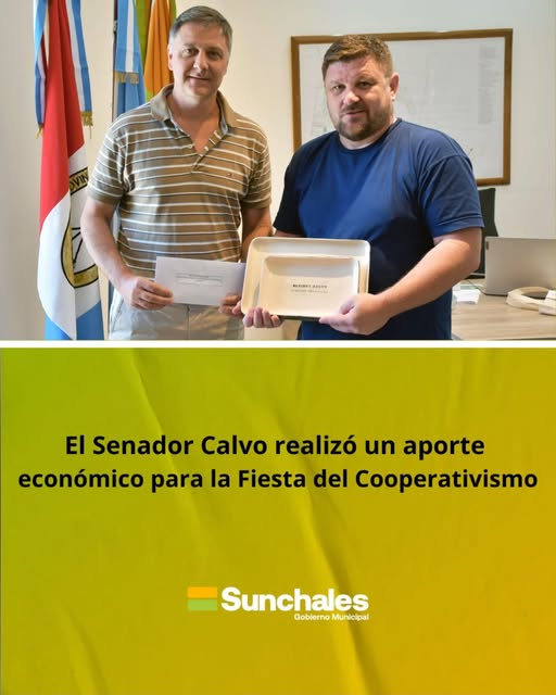 SUNCHALES ( De nuestra Agencia).- Hace unos momentos desde la Municipalidad destacaron que el intendente, Pablo Pinotti, recibió al presidente del Concejo Municipal, Fernando Cattaneo, quien hizo entrega de un aporte económico del senador departamental Alcides Calvo, destinado a acompañar la realización de la Fiesta del Cooperativismo, que se desarrollará en los próximos días, y de un obsequio como gesto de reconocimiento institucional.