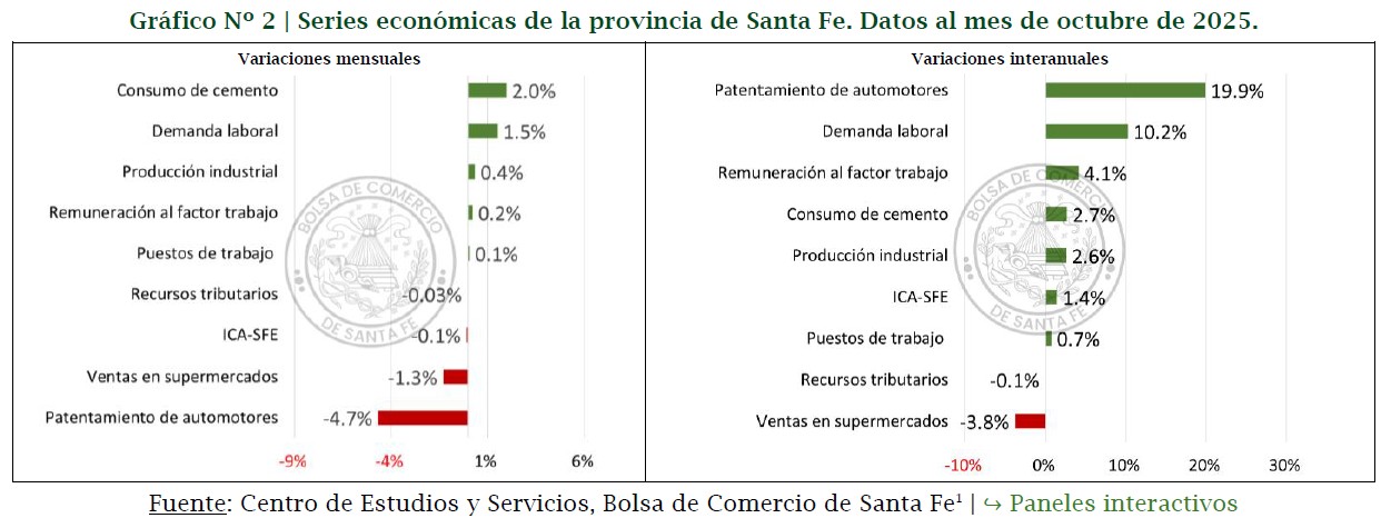 El Índice Compuesto de Actividad Económica de la Provincia de Santa Fe se contrajo 0,1% en octubre de 2025 respecto del mes anterior en tanto que subió 1,4% en la comparación interanual. Así lo sostiene el informe elaborado por el Centro de Estudios y Servicios de la Bolsa de Comercio de Santa Fe, que muestra que cinco de los ocho indicadores que conforman el Índice registraron variaciones mensuales positivas, mientras que las tres restantes mostraron descensos. En la comparación interanual, dos series presentaron caídas en tanto que las demás expresaron subas, aunque con una desaceleración en el ritmo de crecimiento.