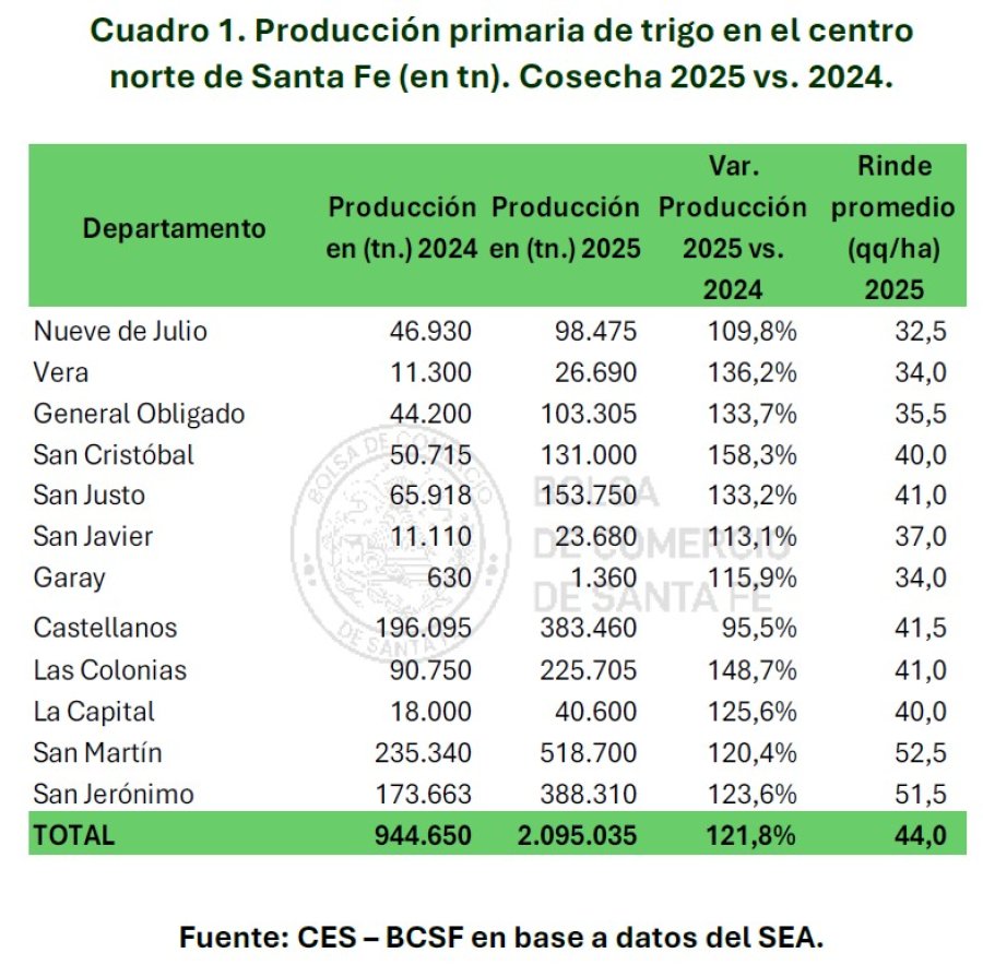 En tanto, un informe especial del Sistema de Estimaciones Agrícolas (SEA) de la Bolsa de Comercio de Santa Fe difundido este jueves señala que en estos días "cierra una campaña triguera en el centro norte santafesino con una producción primaria y rinde récord, aunque con una calidad promedio del cereal menor a los registros previos". "Heterogeneidad por fertilidad de suelos, variedades de semillas utilizadas y un escenario económico-productivo con márgenes brutos diferenciados", sintetiza el documento, cuyas principales consideraciones son las siguientes:
