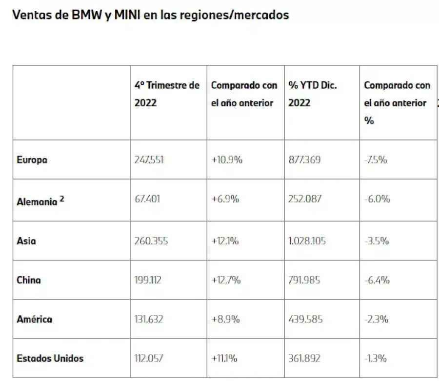 BMW Group entregó un total de 2.399.636 vehículos BMW, MINI y Rolls-Royce a clientes en todo el mundo en 2022 (-4.8%); un año en el que las industrias enfrentaron vientos en contra debido a dificultades de abastecimiento, los cierres en China relacionados a la pandemia y la guerra en Ucrania. El principal impacto se sintió en los primeros seis meses del año, con una disminución de entregas a comparación del año previo, pero las ventas fueron aumentando en el segundo semestre. En el cuarto trimestre, BMW Group reportó un crecimiento significativo en ventas de +10.6% con 651.798 vehículos entregados a clientes.