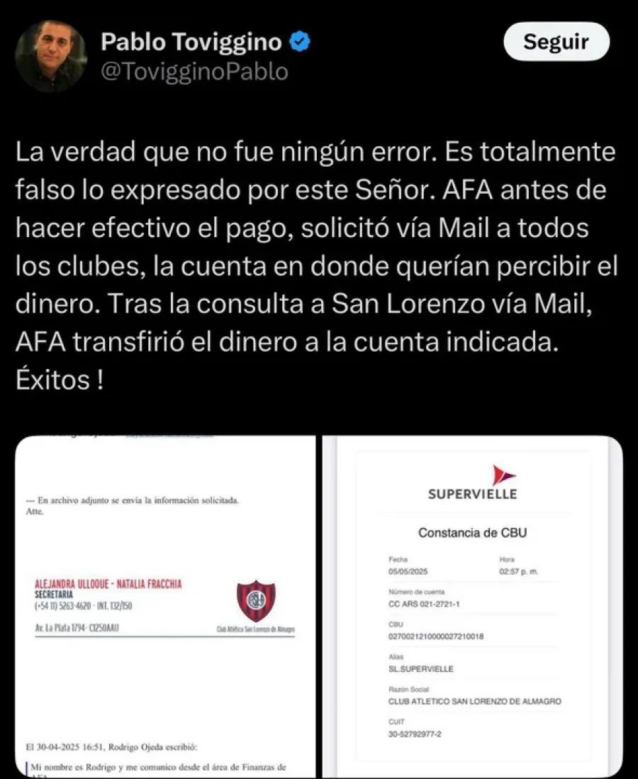 "AFA antes de hacer efectivo el pago, solicitó vía Mail a todos los clubes, la cuenta en donde querían percibir el dinero. Tras la consulta a San Lorenzo vía Mail, AFA transfirió el dinero a la cuenta indicada. ¡Éxitos!", concluyó su publicación el dirigente de AFA.