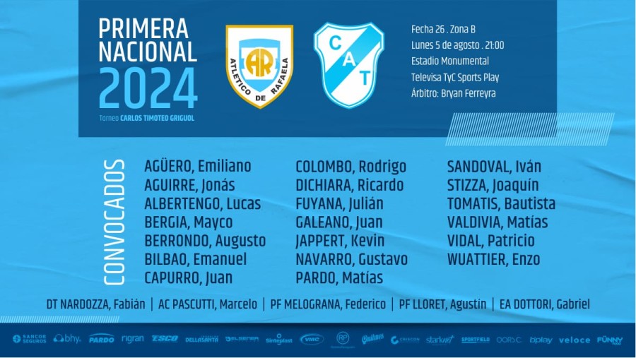 ATLÉTICO DE RAFAELA: Emanuel Bilbao; Julián Fuyana, Gustavo Navarro, Kevin Jappert y Jonás Aguirre; Matías Pardo, Juan Capurro, Juan Galeano y Matías Valdivia; Patricio Vidal o Albertengo y Ricardo Dichiara. DT: Fabián Nardozza.