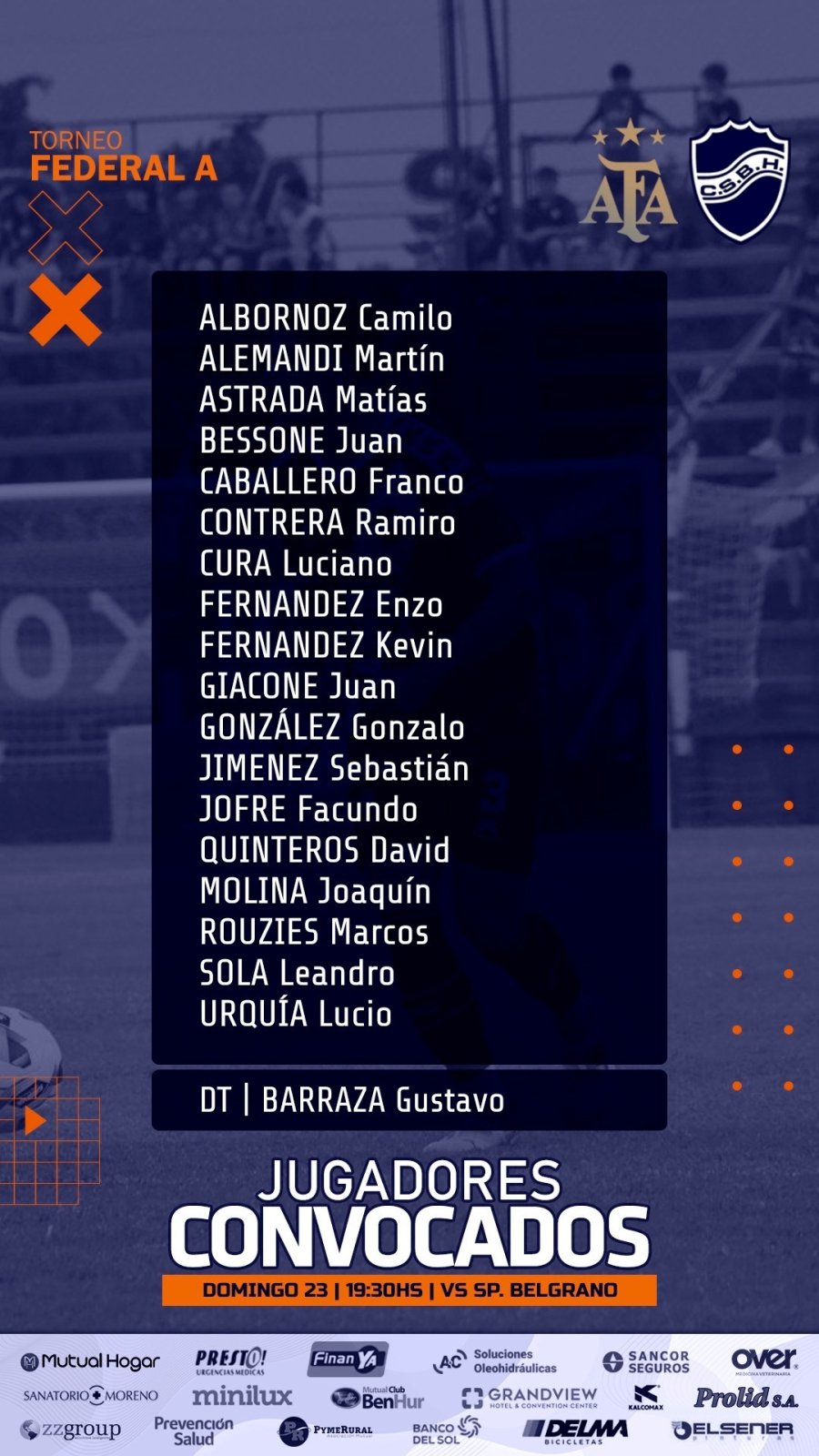 Ben Hur: Gonzalo González; Lucio Urquía, Facundo Jofre, Marcos Rouzies y Martín Alemandi; Kevin Fernández o David Quinteros, Camilo Albornoz, Juan Bessone y Sebastián Jiménez; Enzo Fernández; Joaquín Molina o Juan Cruz Giacone. DT: Gustavo Barraza.Sportivo Belgrano: Santiago Roggero; Leonardo Ferreyra, Braian Camisassa, Camilo Alessandría y Tomás Nallim; Facundo Hang, Pablo Cortizo, Jeremías Giménez y Enzo Avaro; Jorge Rossi y Tomás Attis. DT: Sergio Maza.