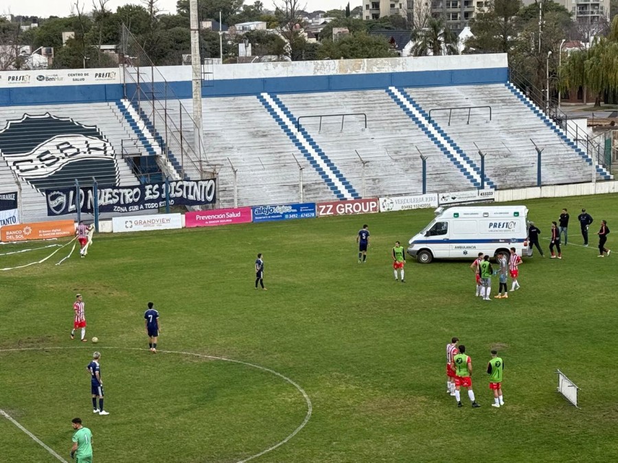 Tras casi media hora el árbitro Matías Billone Carpio decidió suspender el cotejo, previo ingreso de la ambulancia al terreno del campo de juego para llevarse a Sebastián Acuña, jugador de 9 de Julio que no se encontraba en condiciones de continuar el encuentro.