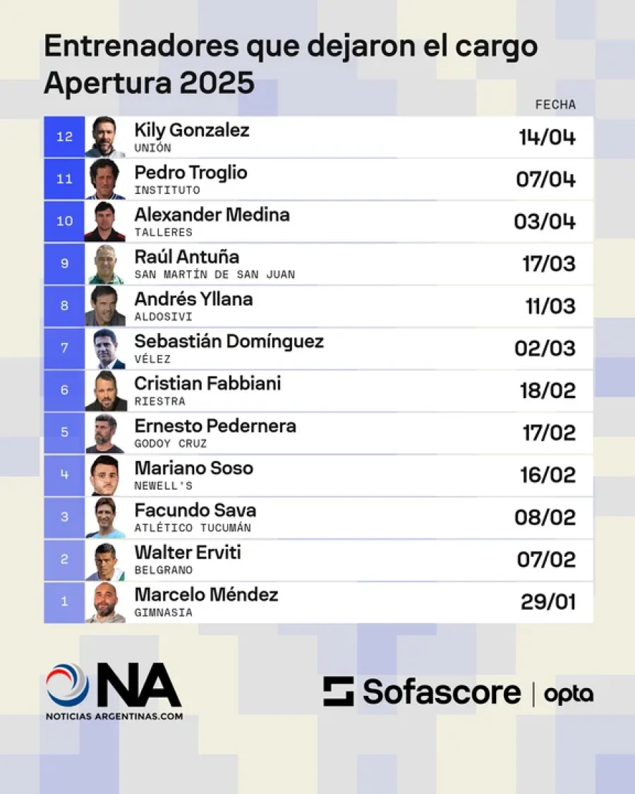 De ahí hasta la fecha, sucedieron las renuncias o despidos de Andrés Yllana en Aldosivi de Mar del Plata, Raúl Antuña en San Martín de San Juan, el uruguayo Alexander Medina en Talleres de Córdoba, Pedro Troglio en Instituto de Córdoba y la reciente salida de Cristián González en Unión de Santa Fe.