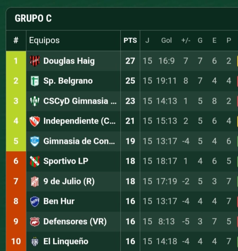 En esta 15ª fecha, la victoria de 9 de Julio por 2 a 0 ante Gimnasia de Chivilcoy lo puso a un punto (junto al Sportivo Las Parejas de Maxi Barbero) de Gimnasia de Concepción del Uruguay, que derrotó por el mismo resultado a Ben Hur. Igualmente, el cuarto Independiente de Chivilcoy tiene 21 puntos, con lo que no está tan tranquilo y el viernes vendrá a Rafaela para enfrentar al equipo de Adrián Gorostidi, uno de los tres últimos con 16.