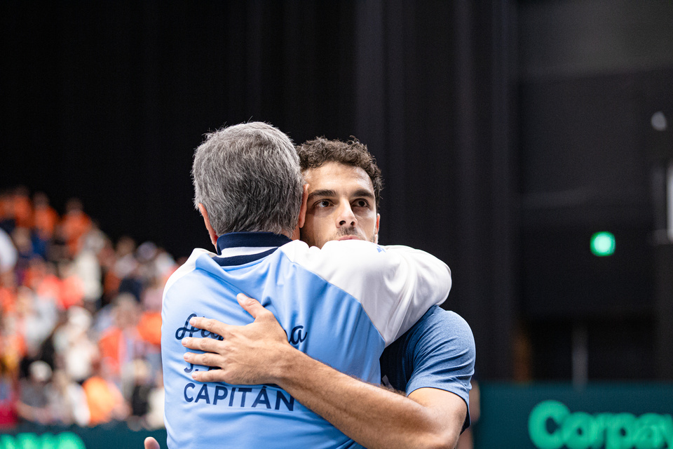 El platense de 26 años debió atravesar varios altibajos durante el primer punto de la eliminatoria, en un partido que tuvo ocho quiebres de servicio y en el que pudo imponerse gracias a una pizca de jerarquía en los momentos calientes, sobre todo porque De Jong demostró buenos pasajes pero demasiadas intermitencias. Con el 1-0 parcial para la Argentina además logró su quinta victoria copera en siete presentaciones en singles. "Fue durísimo. Le quebraba, me devolvía el quiebre, le volvía a quebrar. Pude aprovechar los games importantes cuando él bajó un poquito. Me encanta jugar la Copa Davis; es una competencia importante pero no es fácil, a cada uno le pega diferente. Yo la juego y saco un plus en mi rendimiento", relató Etcheverry una vez consumado el triunfo. A continuación, en otro partido repleto de idas y vueltas, Cerúndolo superó la presión contra un jugador peligroso pero inestable, con el aliento de 40 argentinos ruidosos entre los casi cuatro mil neerlandeses que colmaron el estadio techado. En el primer set, pese a haber estado 4-5 con el servicio del jugador local, el número uno albiceleste recuperó el turno de servicio y forzó el tie break, en el que se puso rápidamente 4-0 y luego pudo cerrarlo por 7-4. Ya en el segundo parcial apareció el Cerúndolo con potencial de top 10: suelto, sin apremios, con el drive fino y con la confianza a pleno, sentenció el partido por 6-1.
