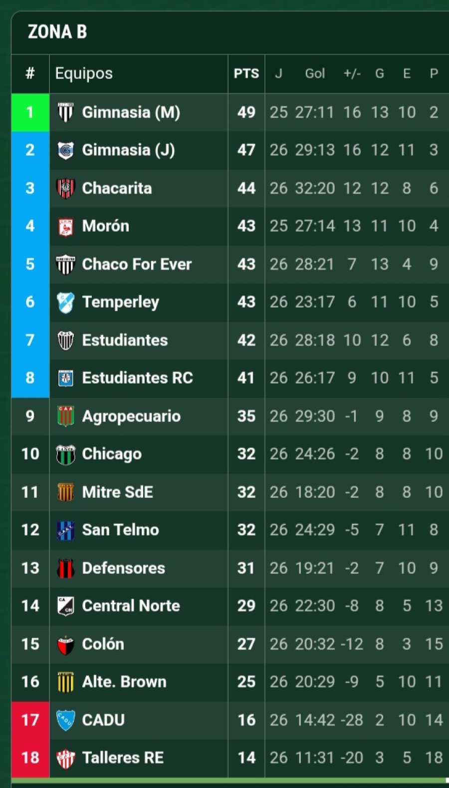 Por su parte, en la zona B, Gimnasia de Mendoza se impuso por 2-0 como visitante ante Chaco For Ever y se mantiene en el primer puesto del grupo con 49 unidades.