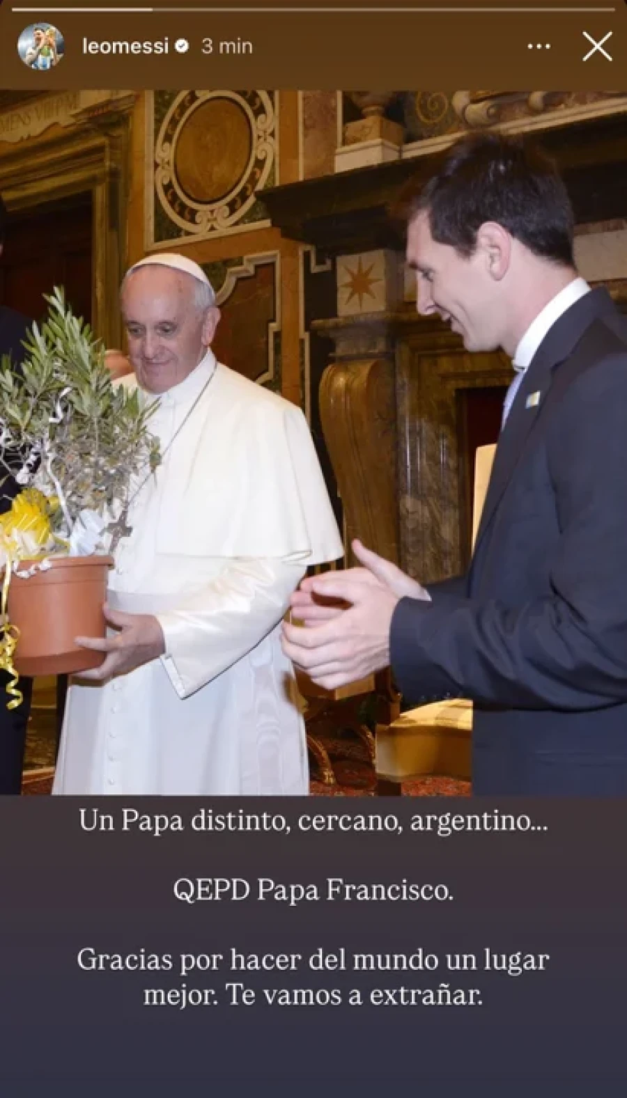 Uno de ellos fue el capitán de la Selección argentina, Lionel Messi, que publicó una historia en su Instagram con una foto juntos sumado a un texto: “Un Papa distinto, cercano, argentino... QEPD Papa Francisco. Gracias por hacer del mundo un lugar mejor. Te vamos a extrañar”.