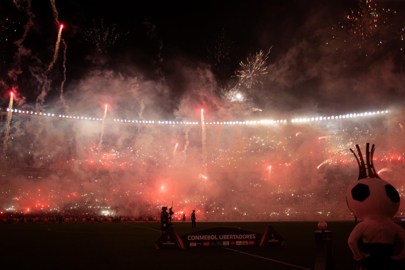 Los hinchas de River encendieron el estadio El Monumental en la salida de los jugadores para la vuelta de las semifinales de la Copa Libertadores ante Atlético Mineiro y “taparon” las tribunas con unaa increíble cantidad de bengalas y fuegos artificiales de color rojo y blanco.