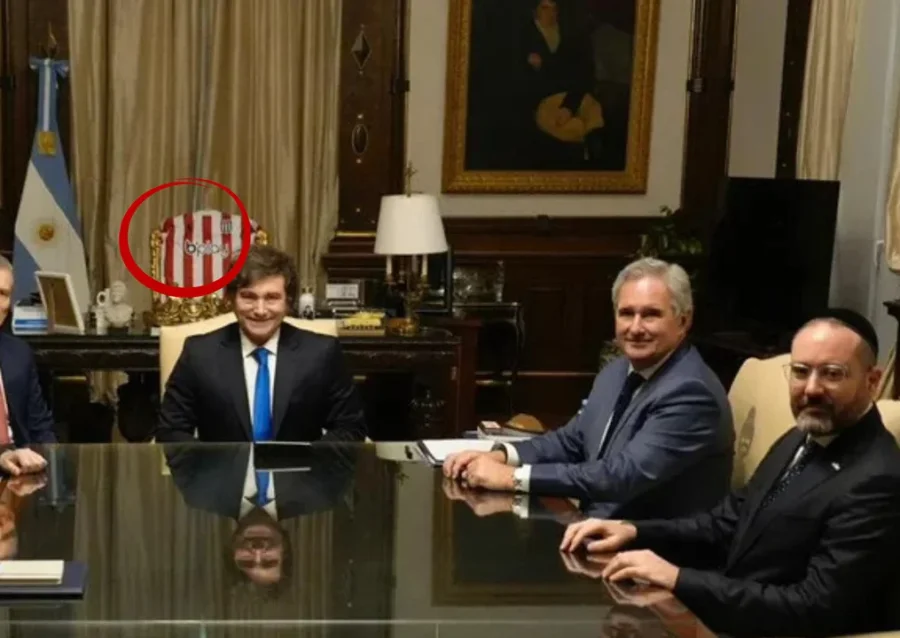 Según informó la Agencia Noticias Argentinas, cuando el mandatario recibió en la Casa Rosada al ministro de Relaciones Exteriores del Estado de Israel, Gideon Sa’ar, y al embajador de Israel en Argentina, Eyal Sela, lo hizo con un detalle llamativo: detrás suyo se podía ver una camiseta de Estudiantes de La Plata.