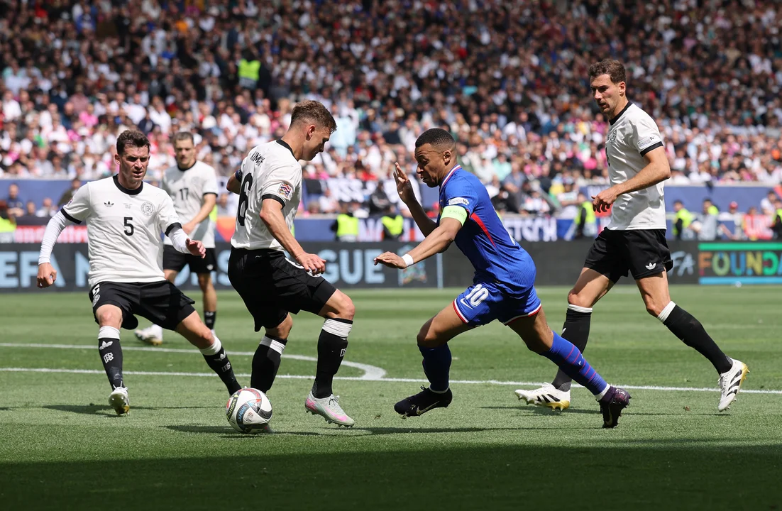 Ya sobre el final del encuentro, Mbappé se las arregló para avanzar ante la floja marca de Alemania, y le cedió la pelota a su compañero Michael Olise para que convirtiera dentro del área el gol del 2 a 0 para Francia a los 39 minutos.