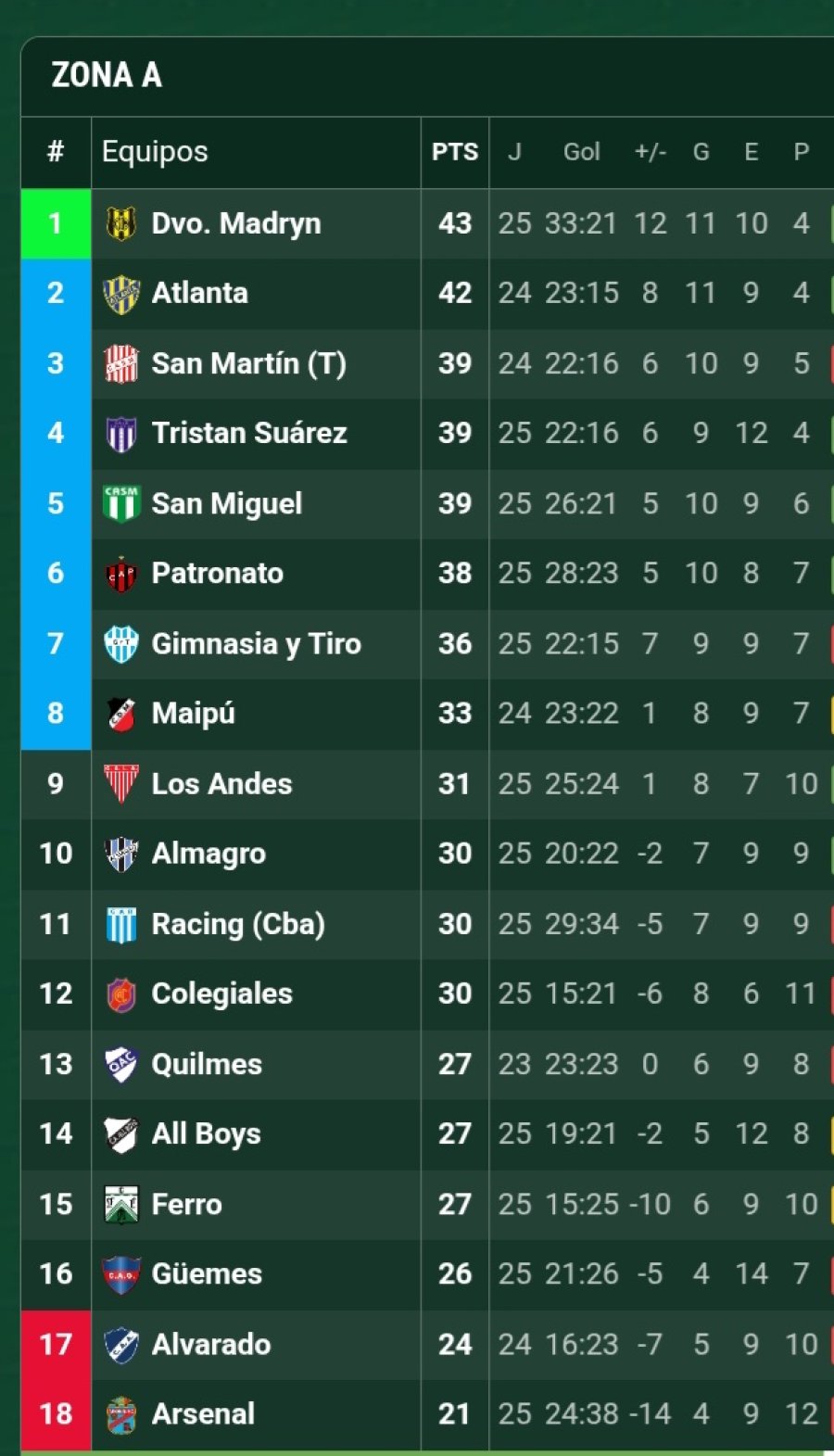 Otro gran triunfo de la jornada fue conseguido por Deportivo Madryn, que venció a Güemes por 3-1 y alcanzó la punta de la zona A por primera vez en el campeonato, con 43 puntos y un partido más que Atlanta.