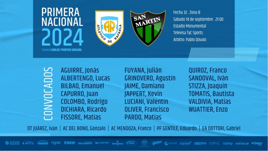 Este viernes Iván Juárez confirmó los 20 para recibir en el Monumental al Santo Sanjuanino, cotejo que se disputará este sábado desde las 21hs, televisado por TyC Sports, con el arbitraje de Pablo Dóvalo.