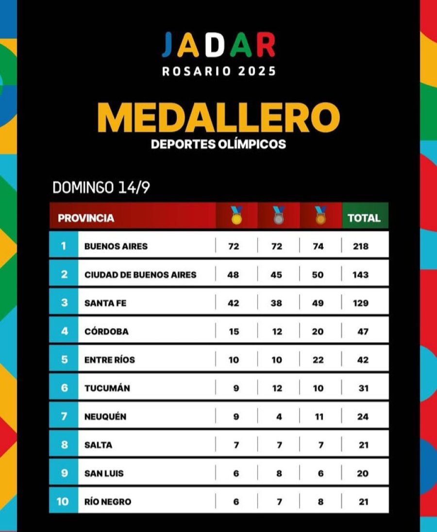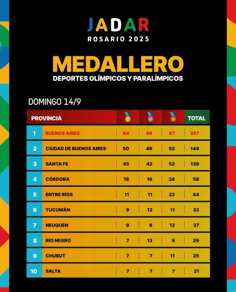La provincia de Buenos Aires se consagró como la gran protagonista, dominando con contundencia tanto el medallero general como los de ramas olímpicas y paralímpicas, demostrando la fortaleza de su desarrollo deportivo. El distrito más grande del país y el que desembarcó en Rosario con la mayor delegación logró 84 medallas de oro, 86 de plata y 87 de bronce, para sumar un total de 257 preseas.