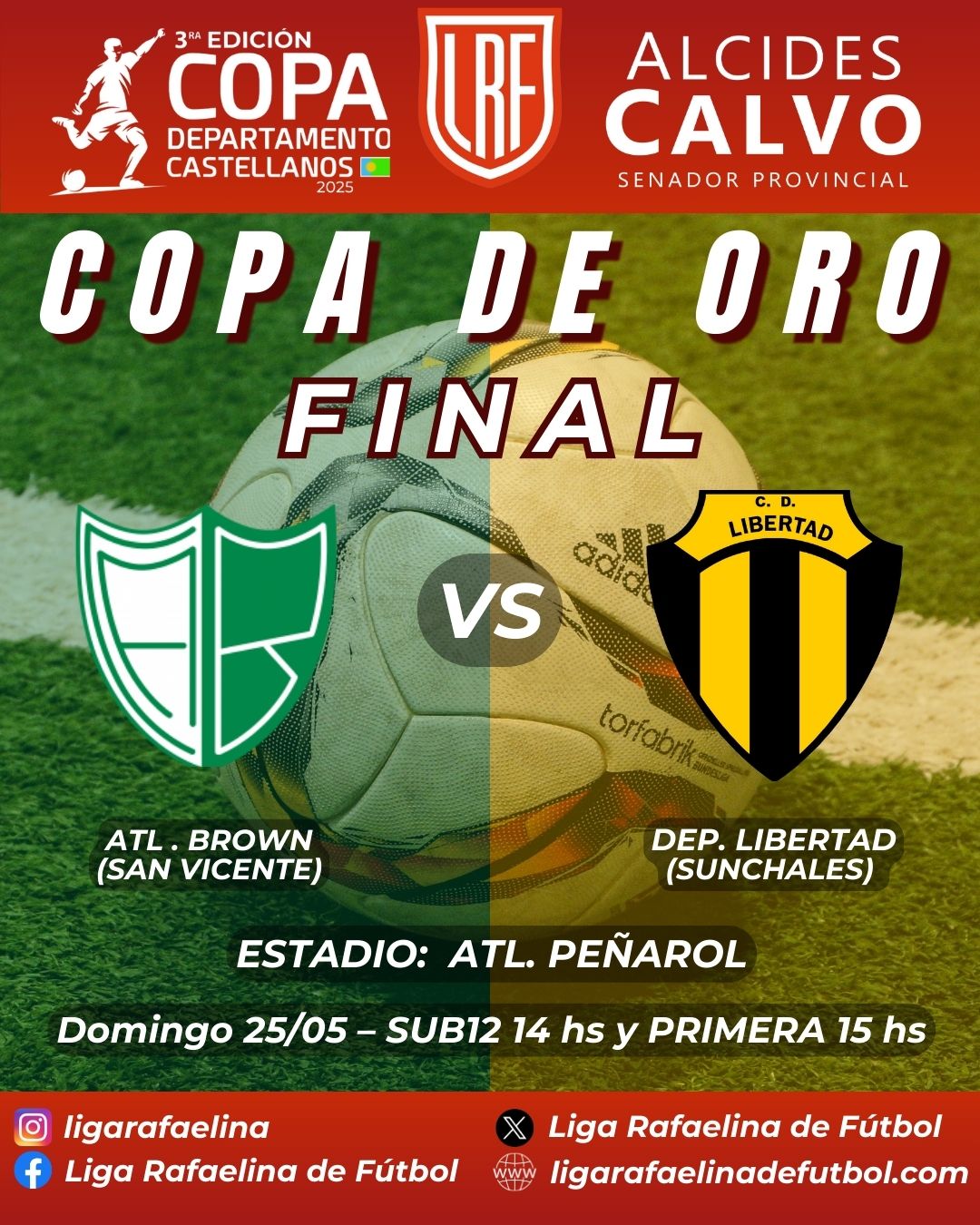 Por cuestiones organizativas, el partido final de "Copa de Oro" de la Copa Departamento Castellanos de la Liga Rafaelina, entre Brown de San Vicente y Deportivo Libertad de Sunchales cambió de escenario y se jugará el próximo domingo 25 de Mayo en cancha de Peñarol.