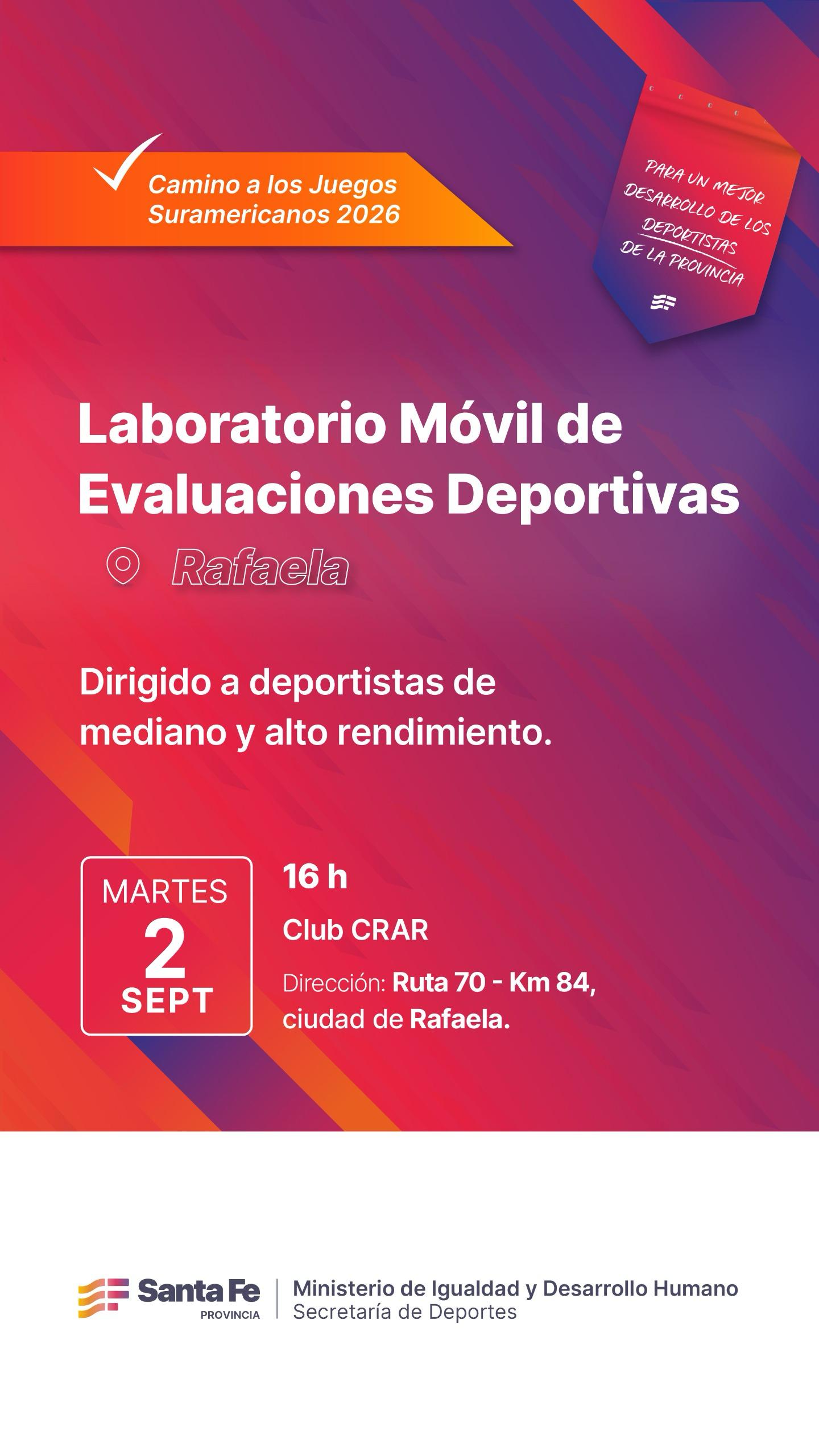 El martes 2 de septiembre, desde las 16, en el Círculo Rafaelino de Rugby se desarrollará la jornada de trabajo del Laboratorio Móvil de Evaluaciones Deportivas, impulsado por la Secretaría de Deportes de la Provincia.
