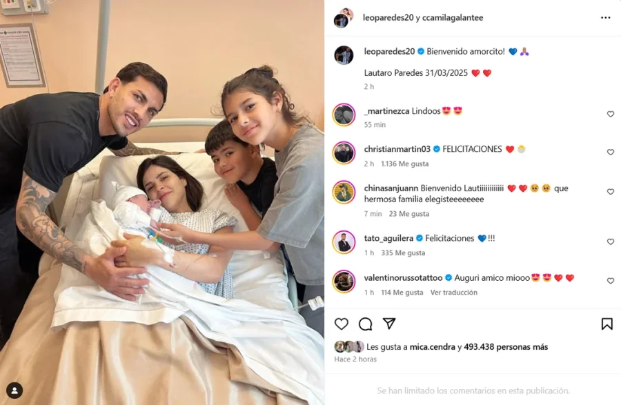 “Bienvenido amorcito! 💙🙏🏽Lautaro Paredes 31/03/2025 ❤️❤️”, escribió el futbolista en un posteo en conjunto con su pareja, quien se encontraba en la camilla del hospital sosteniendo a su bebé en brazos.