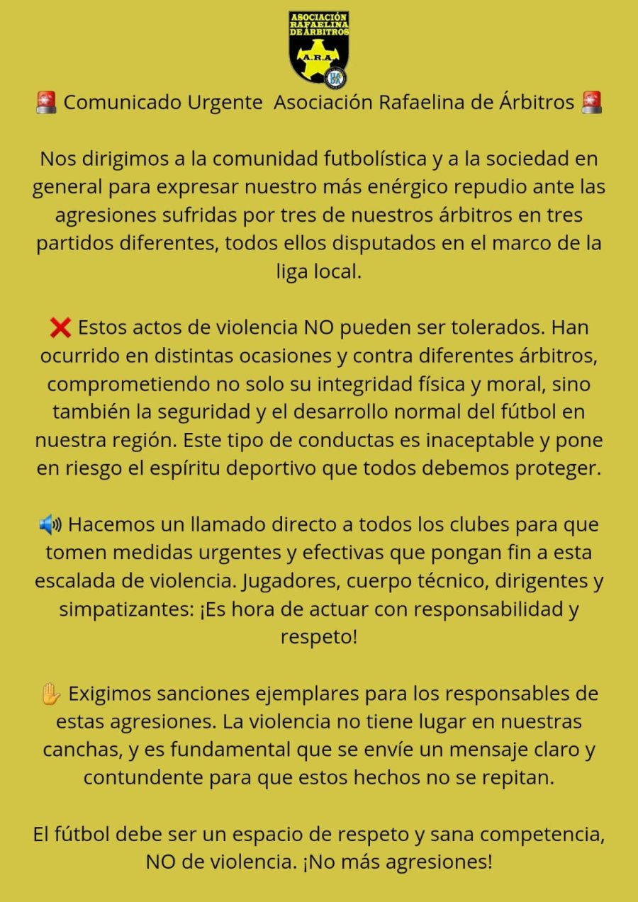 En la mañana de este lunes, la Asociación Rafaelina de Arbitros emitió un comunicado repudiando estos tristes episodios.