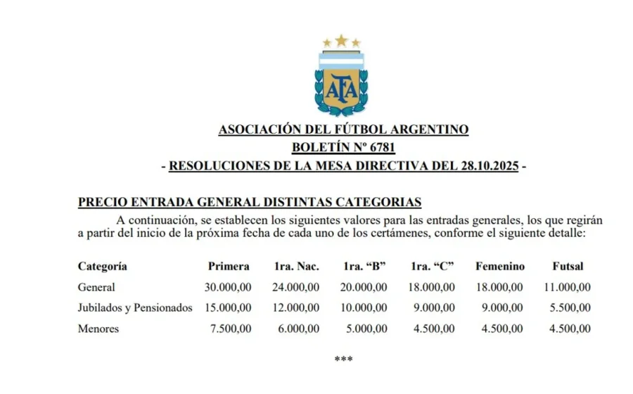 La Asociación del Fútbol Argentino (AFA) confirmó nuevos valores para las entradas del fútbol argentino con aplicación inmediata desde la próxima fecha en todas las categorías.