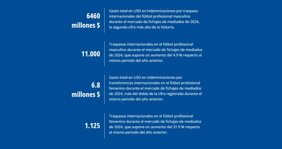 En tanto, en el femenino se invirtieron más de U$S 6.800.000 en fichajes y se realizaron más de 1.100 traspasos en el mundo, lo que supone un aumento del 30% en comparación al mismo período de 2023.