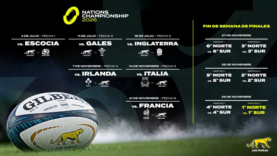 La Unión Argentina de Rugby (UAR) confirmó este lunes el calendario de partidos de Los Pumas en el Nations Championship, el nuevo torneo internacional que debutará en 2026 y que enfrentará a las principales potencias del hemisferio norte y del sur.