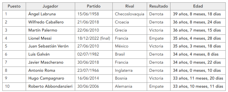 LOS JUGADORES MÁS VETERANOS DE ARGENTINA EN UNA COPA DEL MUNDO: