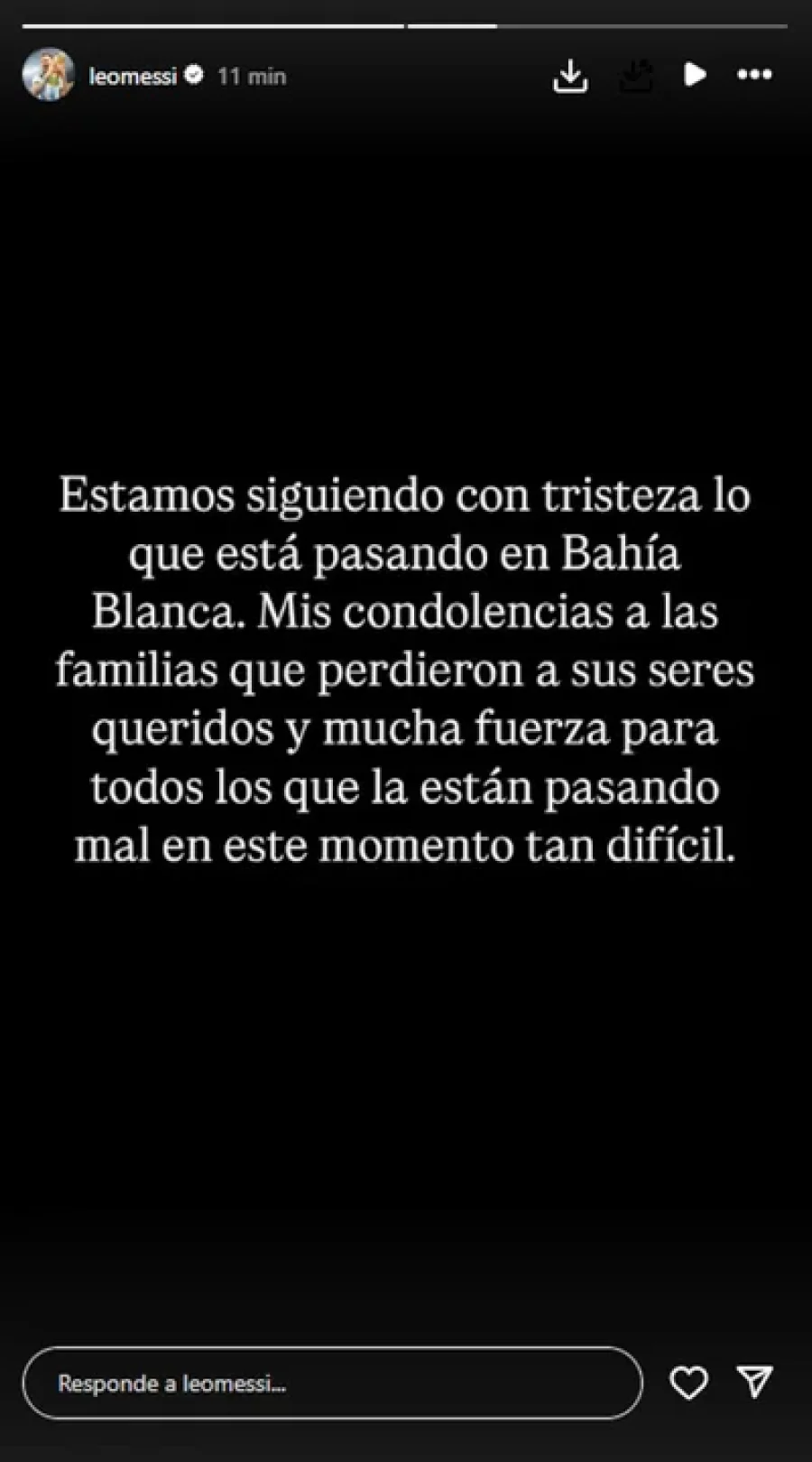“Estamos siguiendo con tristeza lo que está pasando en Bahía Blanca. Mis condolencias a las familias que perdieron a sus seres queridos y mucha fuerza para todos los que la están pasando mal en este momento tan difícil”, escribió el astro rosarino.