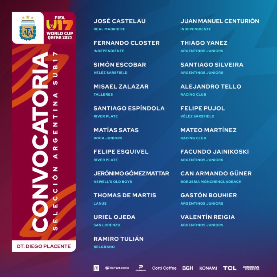 El entrenador de la Selección argentina Sub-17, Diego Placente, dio a conocer los 21 jugadores que representarán a la ´Albiceleste´ en el Mundial de la categoría que se disputará en Qatar desde el 3 de noviembre.