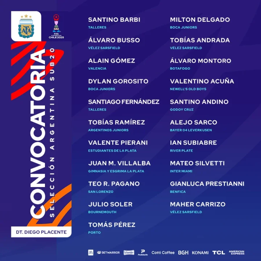 Diego Placente, el director técnico de la Selección Argentina Sub-20, confirmó la lista de 21 convocados para el Mundial de la categoría, que se jugará en Chile del 27 de septiembre al 19 de octubre.