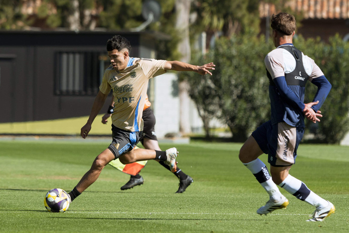 En el complejo Messi de Ezeiza, los futbolistas comenzaron los trabajos en campo con una tradicional entrada en calor de postas, focalizada específicamente en acciones de velocidad y coordinación. Tras la cual, un grupo hizo fútbol formal durante veinte minutos con indicaciones constantes por parte de Scaloni y de su cuerpo técnico. La novedad fue que Claudio Echeverri y Valentín Carboni ensayaron en el equipo mayor en el lugar de hacerlo con la Sub 20. Los dos podrían ir al banco ante los ecuatorianos.