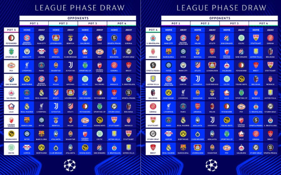 Una de las particularidades del nuevo formato es que los cruces no se repetirán de local y visitante: es decir, cada equipo juega un solo partido contra el rival con el que salió sorteado. Cuatro juegos serán en casa -contra uno de cada bombo- y cuatro de visita -contra el otro de cada bombo-. En este contexto, ya no hay más grupos sino una tabla general: los primeros ocho se clasifican directamente a octavos de final, y del 9 al 24°, a los 16° de final.