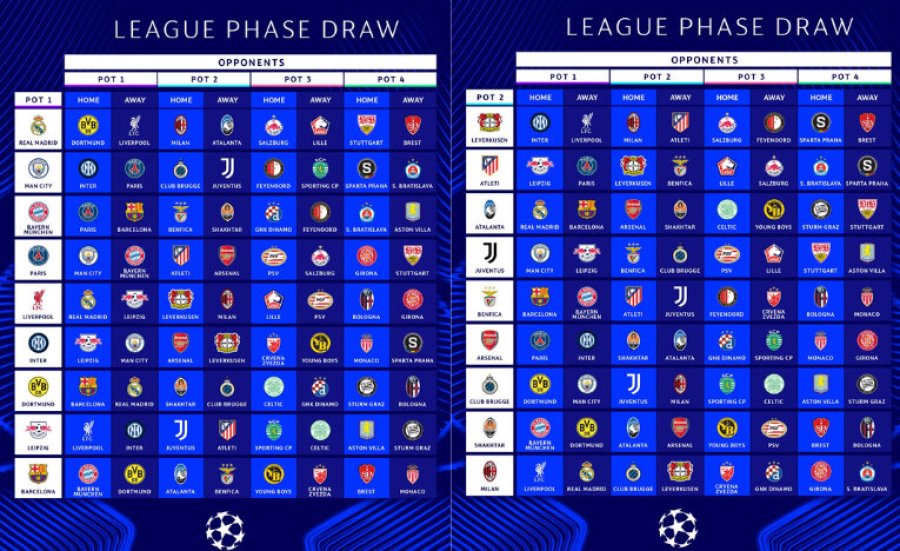 Con Gianluigi Buffon y Cristiano Ronaldo como actores principales, los partidos de la fase de liga de esta Champions quedaron conformados a medida que el exarquero italiano iba sacando a los equipos de los bombos y el portugués apretaba un botón para que la computadora hiciera lo suyo. Cada equipo jugará ocho partidos: dos contra rivales del bombo 1 (los de mejor presente), dos contra rivales del bombo 2, dos contra rivales del bombo 3 y dos contra rivales del bombo 4.