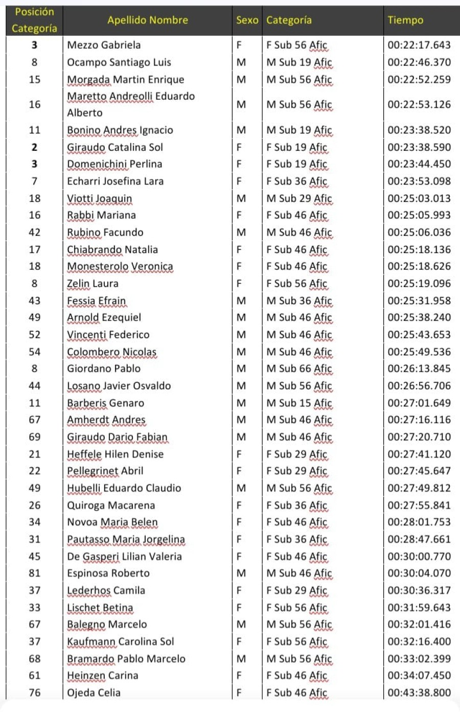 La clasificación de los nadadores del Natatorio Amancay según el tiempo de llegada fue: