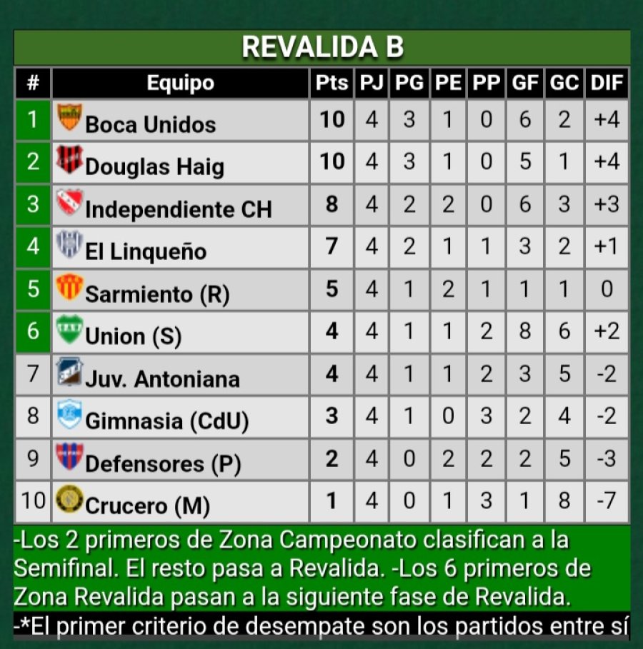 El descenso en la Zona B (los dos últimos pierden la categoría) quedó así: Douglas Haig y El Linqueño 29; Independiente 27; Boca Unidos 24; Juventud Antoniana 23; Unión 20; Sarmiento 17; Crucero del Norte 16; DEPRO 15; Gimnasia 14.