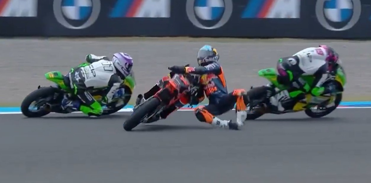 ¡FEA CAÍDA DE #PERRONE! Valentín estaba cerrando una gran carrera, pero sufrió un toque y se fue al suelo en el #ArgentinaGP. 😰🇦🇷 pic.twitter.com/RuSw3i7mza