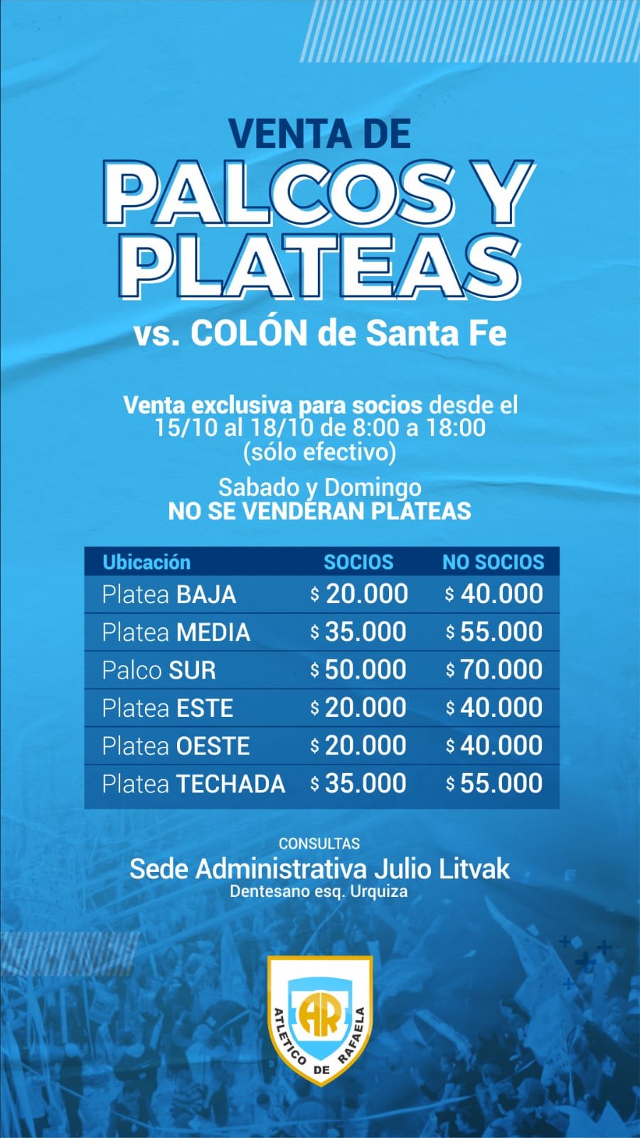 El área de prensa de Atlético de Rafaela informó este martes que desde hoy y hasta el viernes saldrán a la venta palcos y plateas para el gran partido que jugará la Crema frente a Colón de Santa Fe, el domingo a las 17.20 en el estadio Monumental, por la penúltima feha de la Primera Nacional.