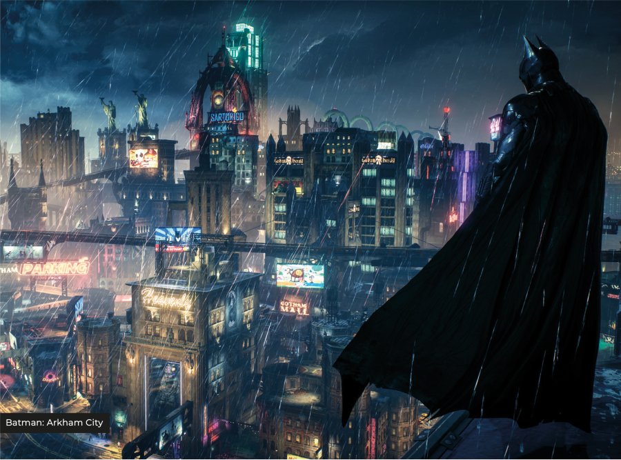Batman: Arkham City de Rocksteady Studios es un videojuego en el que el diseño de los espacios también se emplea para transmitir una determinada carga psicológica. Ciudad Gótica ha sido desarrollada con un estilo lúgubre y nostálgico; a su vez, es un espacio que hay que recorrer con los sentidos en alerta ya que el peligro acecha en cada esquina.