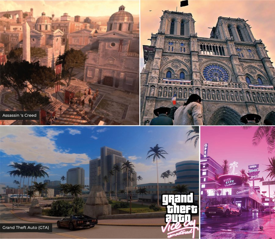 A lo largo de las diversas entregas, el personaje principal se traslada por ciudades como Roma, Florencia o Atenas en épocas antiguas. Estas ciudades han sido desarrolladas con un alto nivel de detalles y precisión histórica. Un ejemplo de esto es el diseño de la catedral de Notre Dame que, actualmente, se está tomando como referencia para los trabajos de reconstrucción tras el incendio del año 2019.