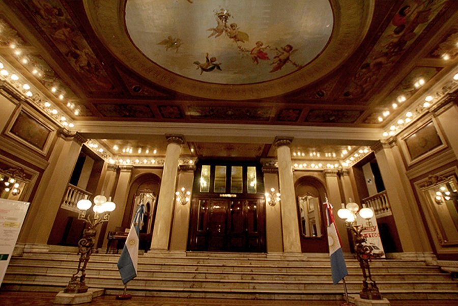 Luego de traspasar el ingreso se accede a un vestíbulo bajo, y si bien la arquitectura tiene una fuerte impronta clasicista, las decoraciones y los acabados se emparentan con el estilo neobarroco, por sus pinturas y decoraciones en cielosrrasos y muros, adornos en bronce, mármoles, arañas, terciopelo rojo, muebles estilo Luis XV, banquetas y paños.