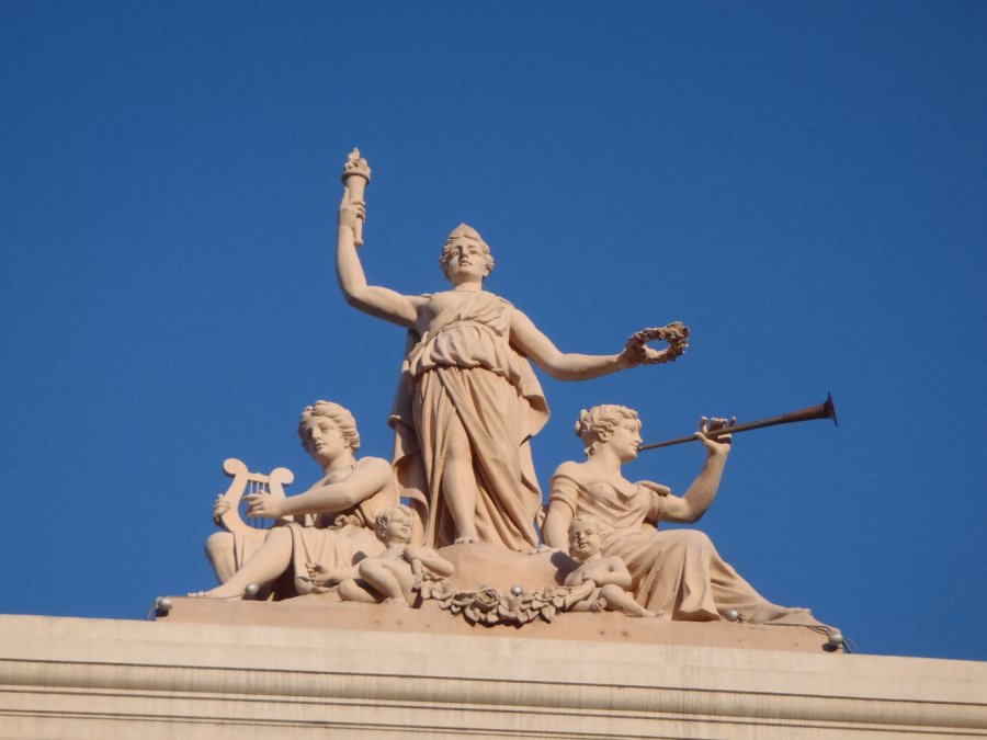 La decoración fue confiada al artista plástico italiano Arturo Nembrini Gonzaga. Sus trabajos se pueden observar principalmente en los relieves de la fachada y la neoclásica escultura que corona la parte central del ático.