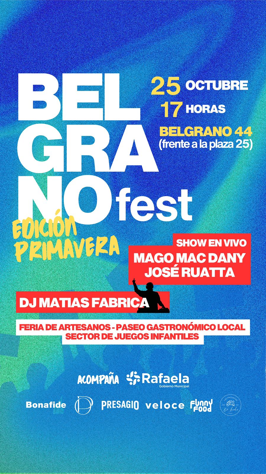 “Belgrano Fest, edición primavera, es la tercera edición que realizamos de este evento. En esta ocasión se hace el 25 de octubre, desde las 17 horas, frente a la Plaza 25 de Mayo. Va a haber show de magia, DJ en vivo, feria de artesanos, paseo gastronómico local y sector de juegos infantiles”, explicó Ignacio, uno de los organizadores.