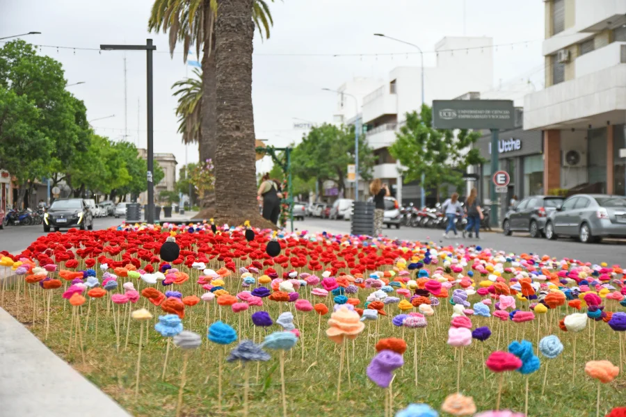 En esta oportunidad, el estallido de bomba de lana llegó a una gran cantidad de personas que se acercaron para sacarse una foto durante el sábado. Pese a que las nubes grises tapaban cualquier rayo de sol, las flores seguían ahí, iluminando el centro de la ciudad. Todavía está también el marco del Día de la Madre que puso a disposición el Paseo del Centro. De fondo, para quienes eligen sacarse fotos allí, asoman las rosas coloridas.